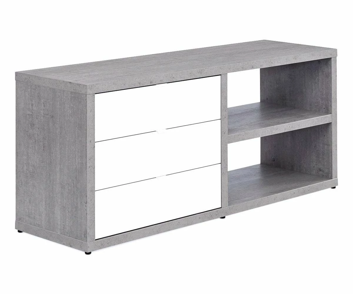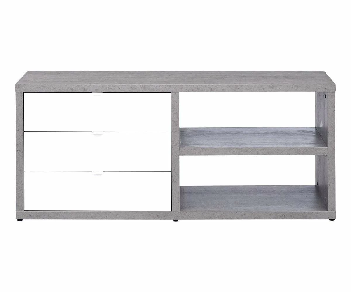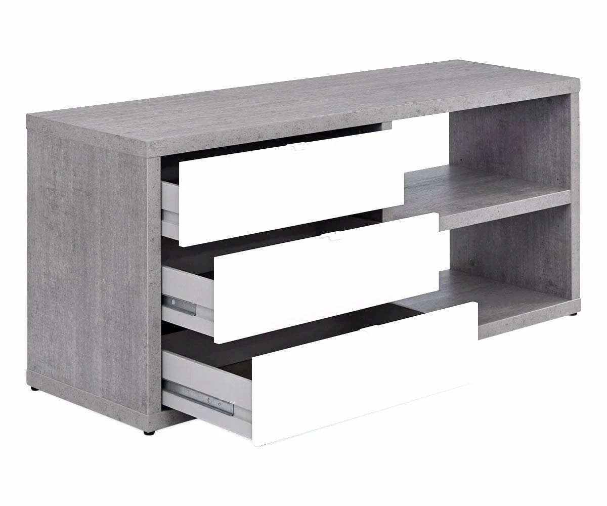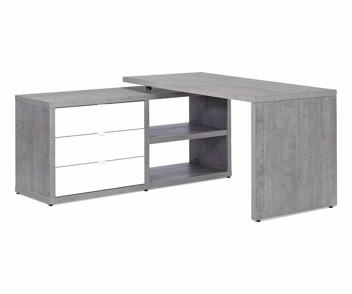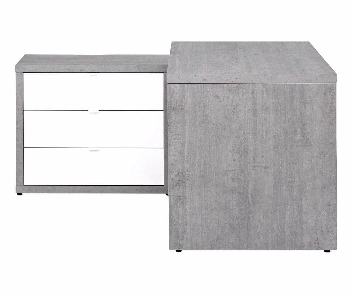Anchor your workspace with the stylish and functional Sten 60β Desk with storage return. The main surface is shaped by the straight, clean lines that lead to the prominent return with two open shelves and three deep drawers. The overall L-shape of this piece allows it to fit nicely into a corner or stand handsomely in an open area of your room. Featuring a mixture of a faux-cement finish and high-gloss white surfaces, this Italian-crafted desk system brings a cool modern industrial vibe to your office space.