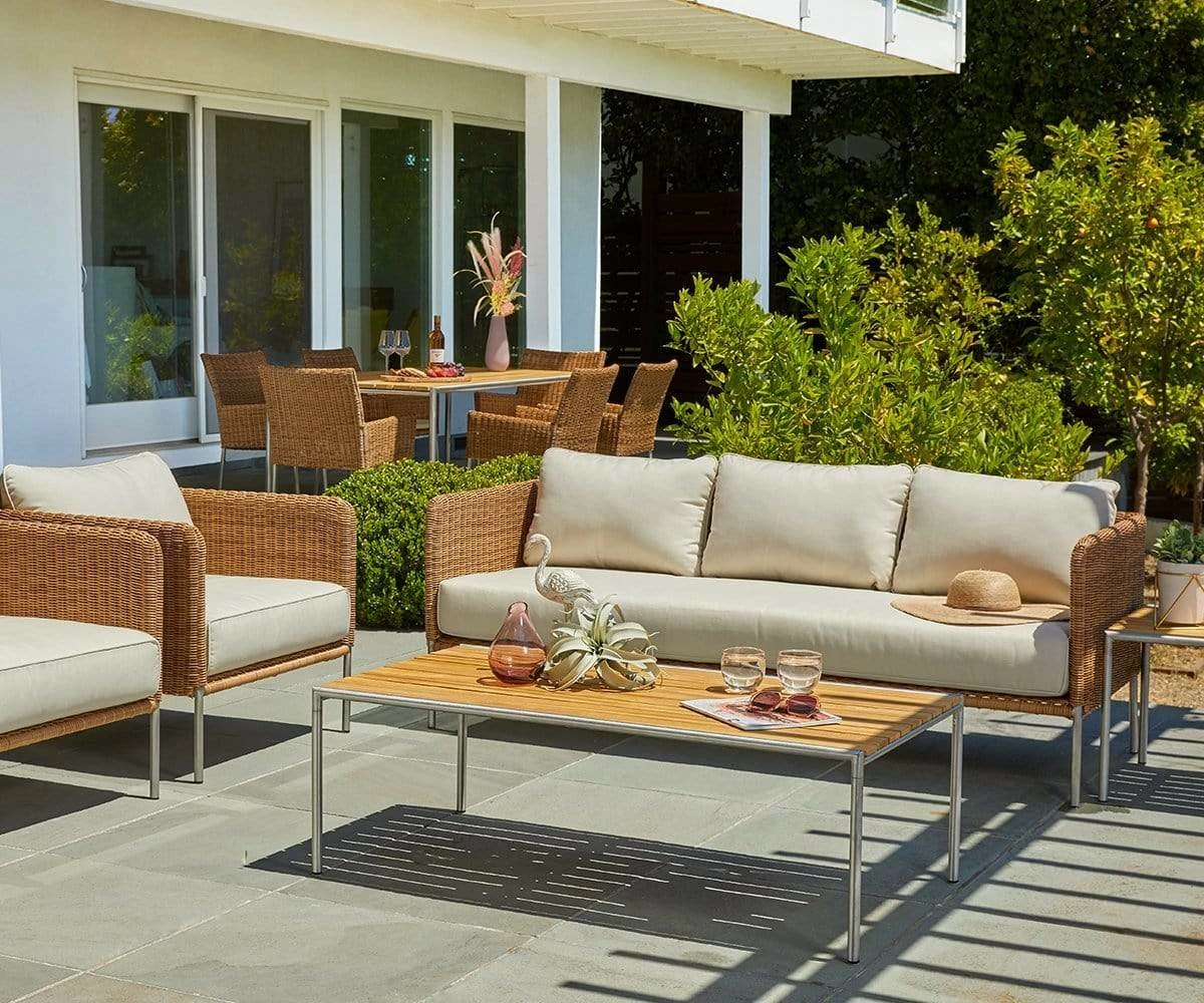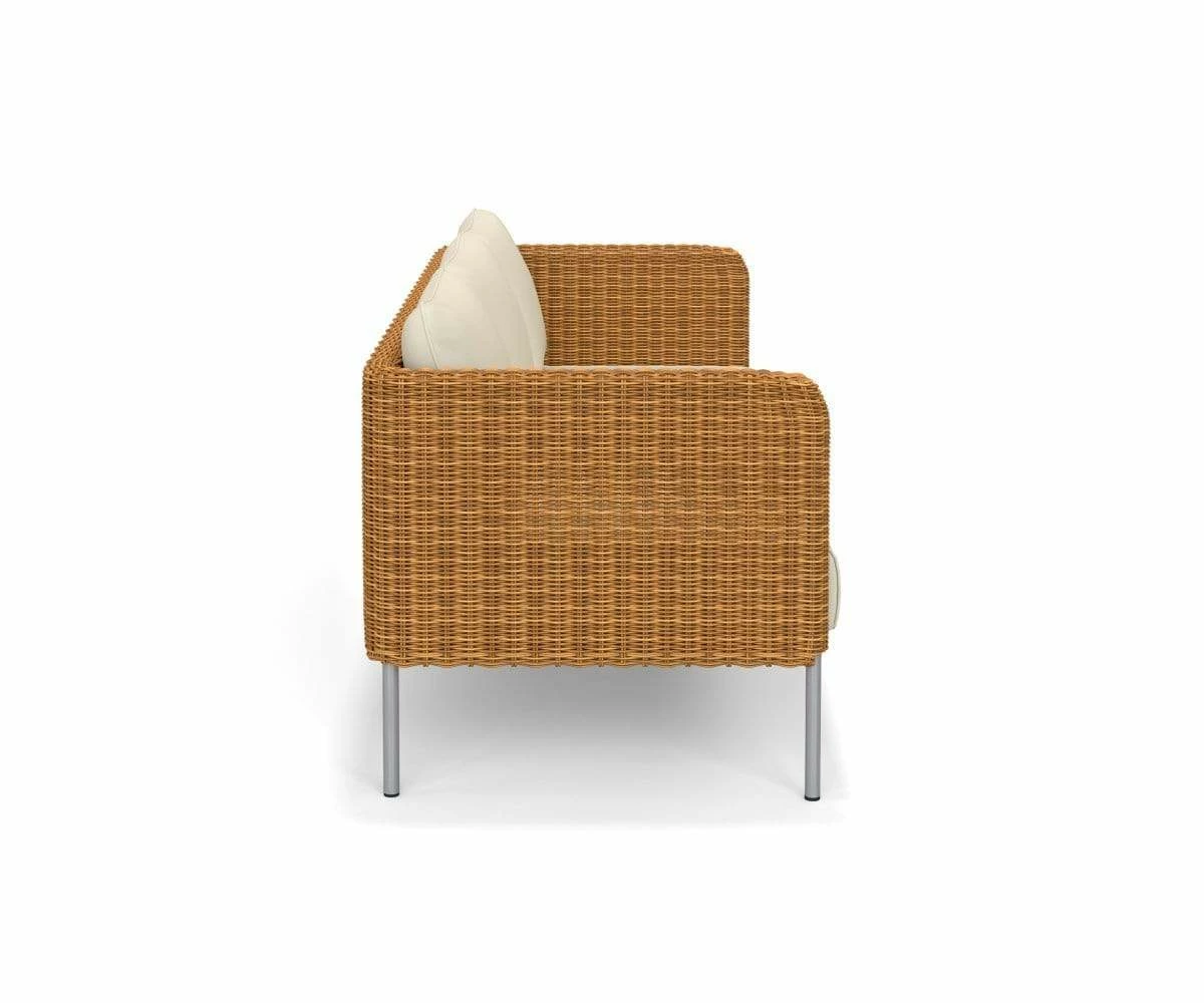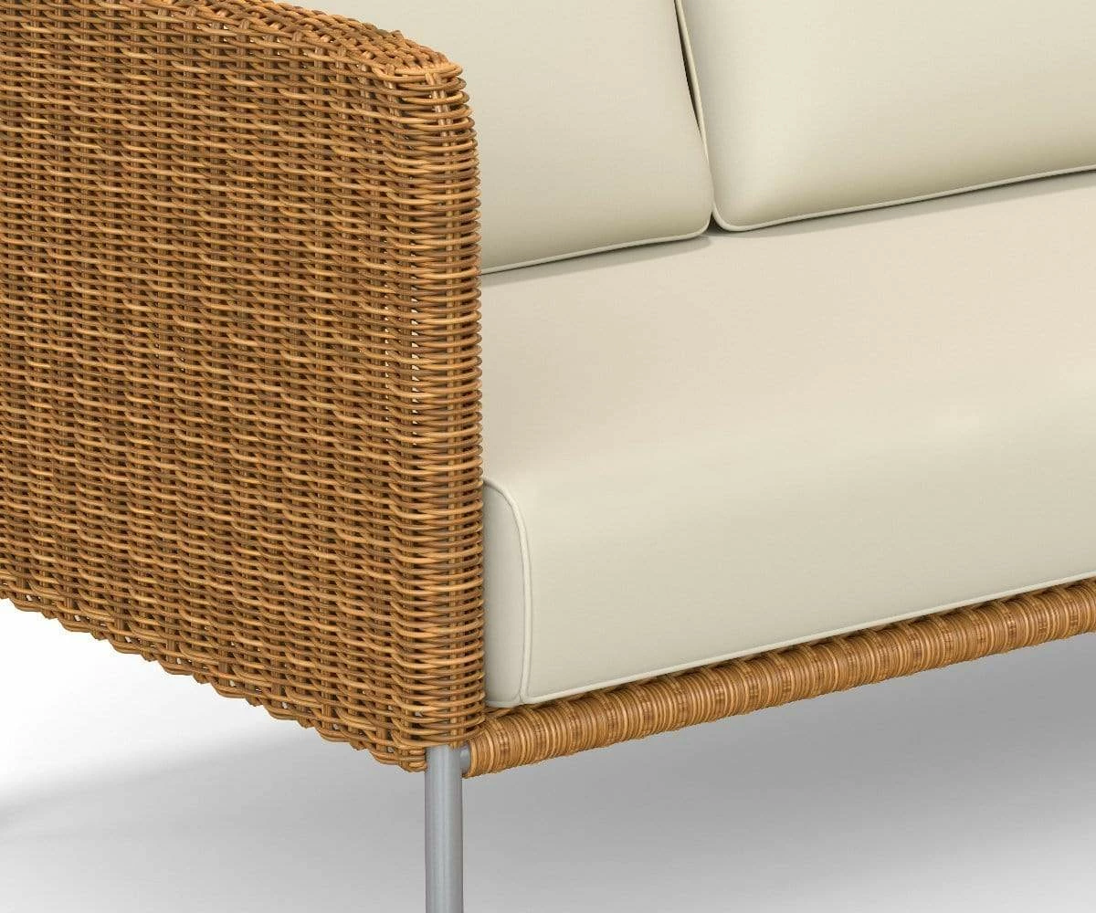 The Palm Bay Outdoor Sofa is where comfort meets the great outdoors. Faux-rattan gives this piece a stylish texture that brings to mind warm seaside breezes and sunny days of relaxation. Stainless steel legs and upholstered cushions are both durable and designed to resist fading, mildew and UV damage.