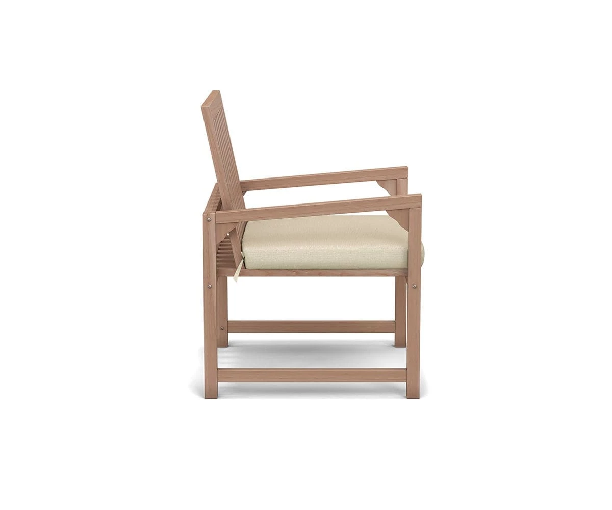 Sit outside in style on the Lahaina Outdoor Chair. This sleek, slatted piece comes with a pillow for the seat, although the finished surface of this chair means that you can sit easily with or without this addition. Crafted from weather-resistant teak, this piece features comfortably angled arms, wide seats, and a stable frame. Pair this modern chair beautifully with the rest of the Lahaina collection, or enjoy the way it effortlessly meshes with any number of styles.